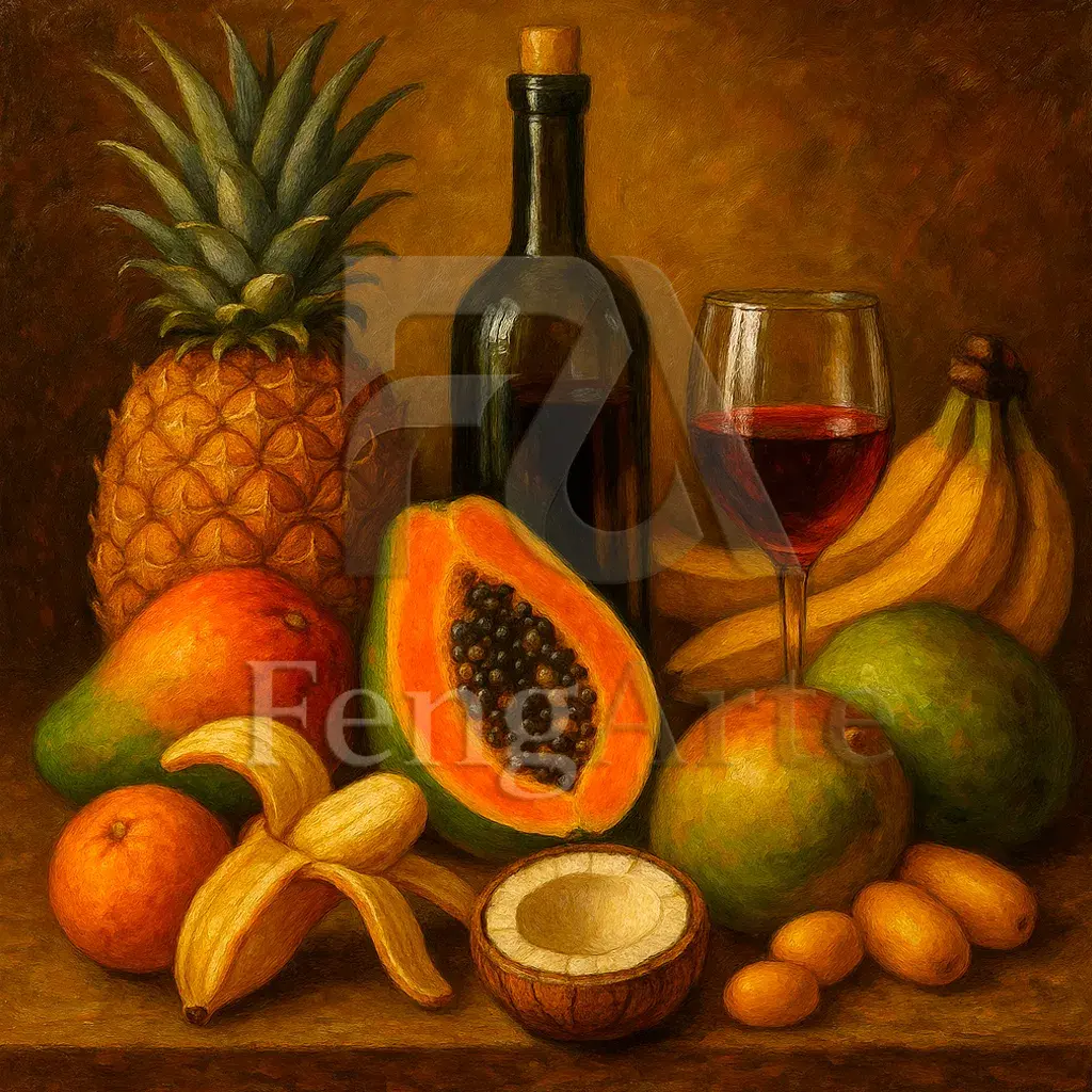 Este cuadro de naturaleza muerta presenta una composición rica y armoniosa de diversas frutas tropicales dispuestas sobre una superficie de madera oscura, una mesa. La luz incide suavemente desde la izquierda, resaltando las texturas y los colores vibrantes de cada elemento.