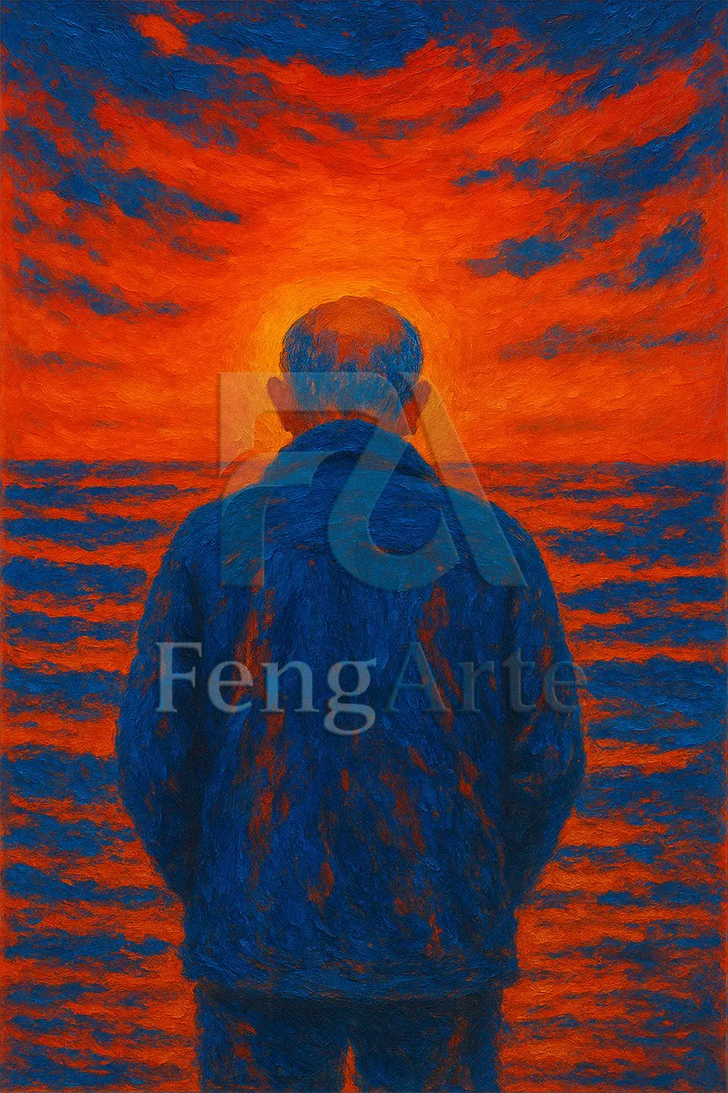 Este cuadro sobre lienzo de formato vertical presenta una figura solitaria de espaldas, vestida con una prenda azul oscura, contemplando un vasto océano bajo un cielo dramático al atardecer. La composición está dividida horizontalmente por la línea del horizonte, con el océano ocupando la mitad inferior y el cielo la mitad superior.
