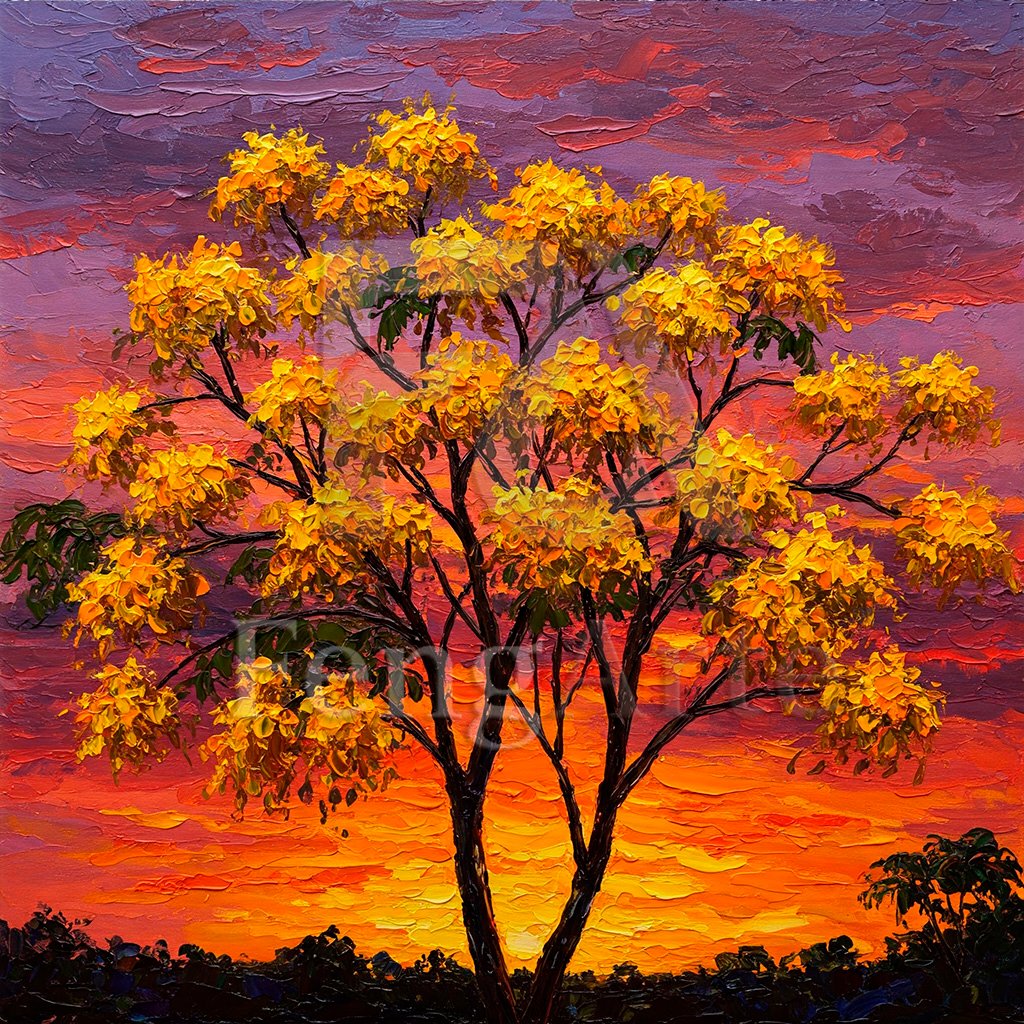 - Colores: El amarillo brillante de las flores se asocia con la alegría, la vitalidad, la prosperidad y el elemento Tierra, que aporta estabilidad y nutrición. Los tonos naranjas y rojizos del cielo evocan el elemento Fuego, representando la pasión, la inspiración y la energía. Los toques de morado pueden simbolizar espiritualidad y transformación.