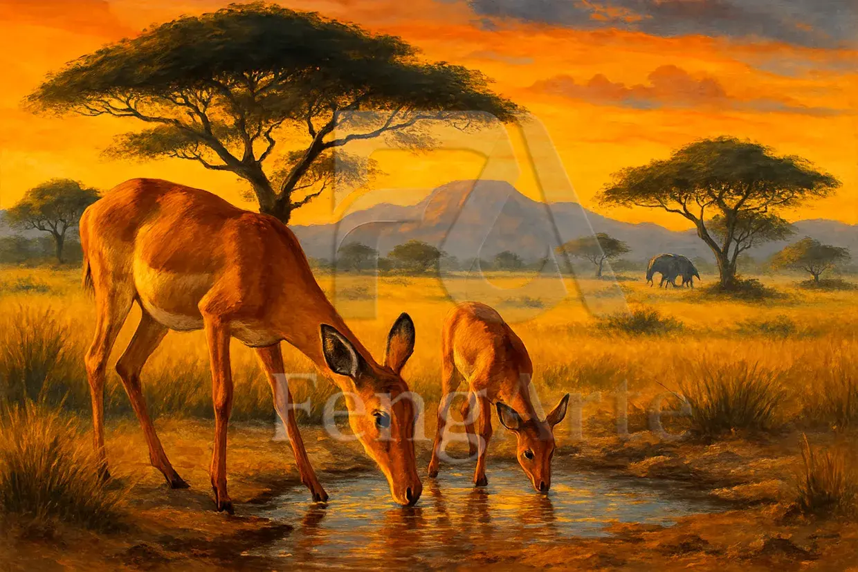 Este óleo sobre lienzo captura una escena serena y evocadora de la vida salvaje africana al atardecer. Dos kudus de pelaje marrón rojizo, una hembra adulta y su cría, se inclinan para beber de un tranquilo abrevadero que refleja los tonos cálidos del cielo. Sus cuerpos esbeltos y sus elegantes cuernos espirales (presentes en la hembra adulta, aunque más pequeños) se destacan contra el paisaje circundante.