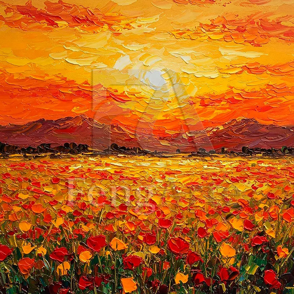 Este es un cuadro vibrante y enérgico que captura un paisaje al atardecer o al amanecer sobre un extenso campo de flores, presumiblemente amapolas por sus tonos rojizos y anaranjados. La técnica pictórica parece ser de empaste, con pinceladas gruesas y texturizadas que dan volumen y dinamismo a la escena.