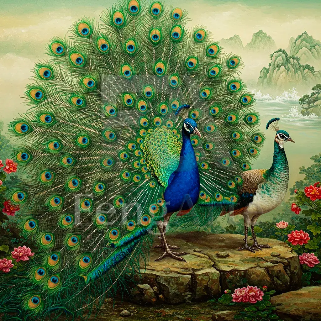 En resumen, este cuadro es una celebración de la belleza natural, la elegancia y el simbolismo auspicioso del pavo real. La riqueza de los colores, la serenidad del paisaje y la presencia de la pareja de aves lo convierten en una obra visualmente atractiva y llena de significado positivo según el Feng Shui.