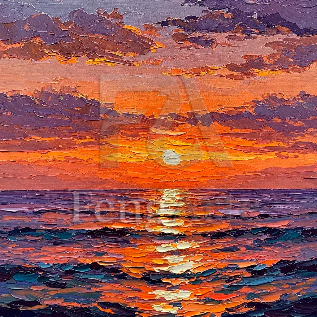 En resumen, este cuadro es una representación vívida y llena de energía de un atardecer sobre el océano, con elementos que resuenan con la calma, la prosperidad, la culminación y las nuevas oportunidades según los principios del Feng Shui.