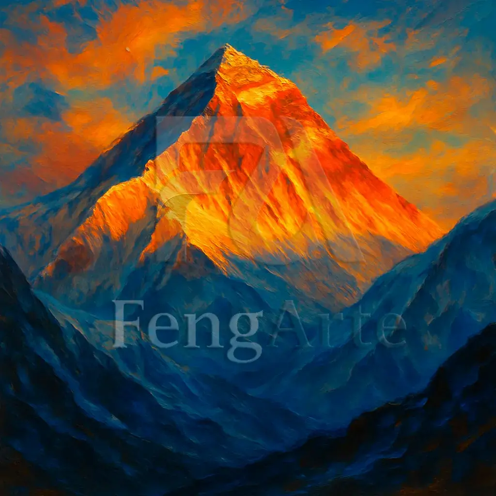 Este impactante cuadro presenta una majestuosa montaña que domina el paisaje, capturada con una pincelada expresiva y una paleta de colores vibrantes que resaltan su imponente presencia. La cima de la montaña está bañada por una intensa luz dorada y naranja, sugiriendo el sol naciente o poniente, lo que crea un fuerte contraste con las laderas inferiores, sumidas en tonos más fríos de azul y púrpura.
