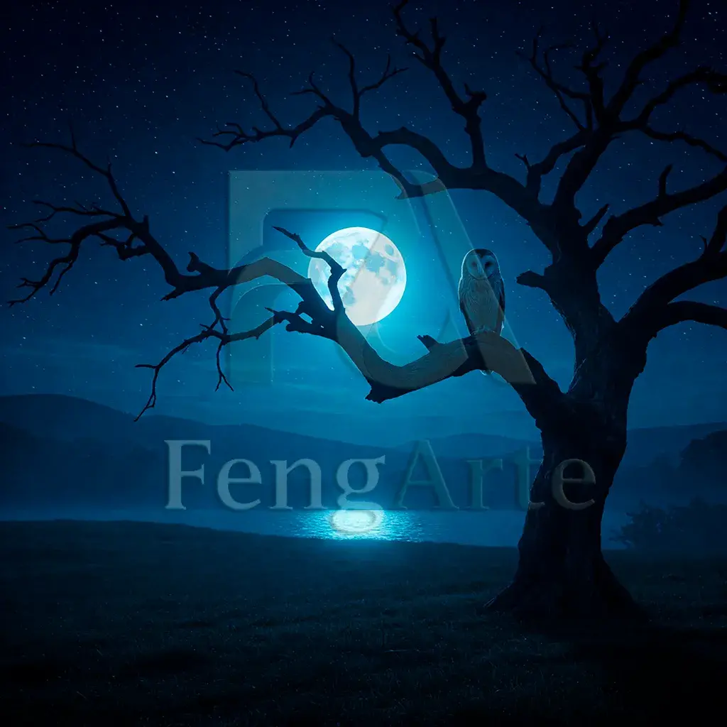 Un cuadro sereno y misterioso de un búho en un árbol bajo la luz de la luna y las estrellas desde la perspectiva del Feng Shui.
